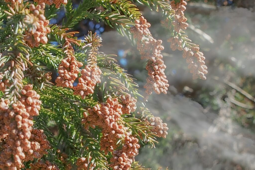 雨が降ったあとには、花粉が流れて黄色い跡が残ることもあります。もうね、その光景はドロドロですよ。黄色い粘土のようになります。