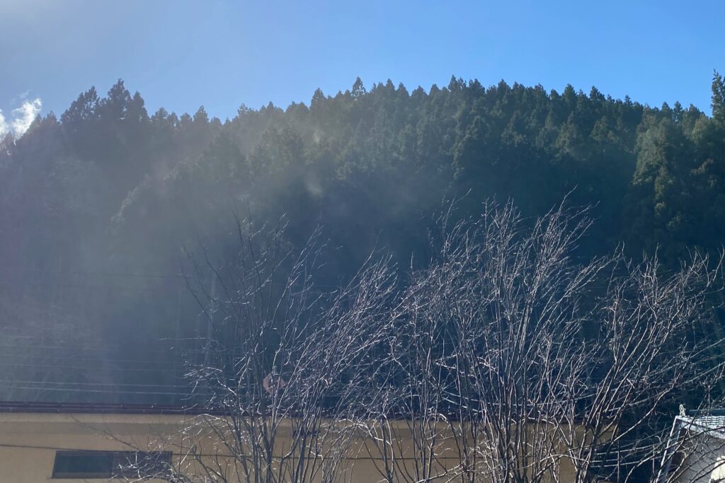 春になるまで花粉の放出を待った木々たち。その木々が育つ山から花粉がぶわぁ~っと飛び始めます。